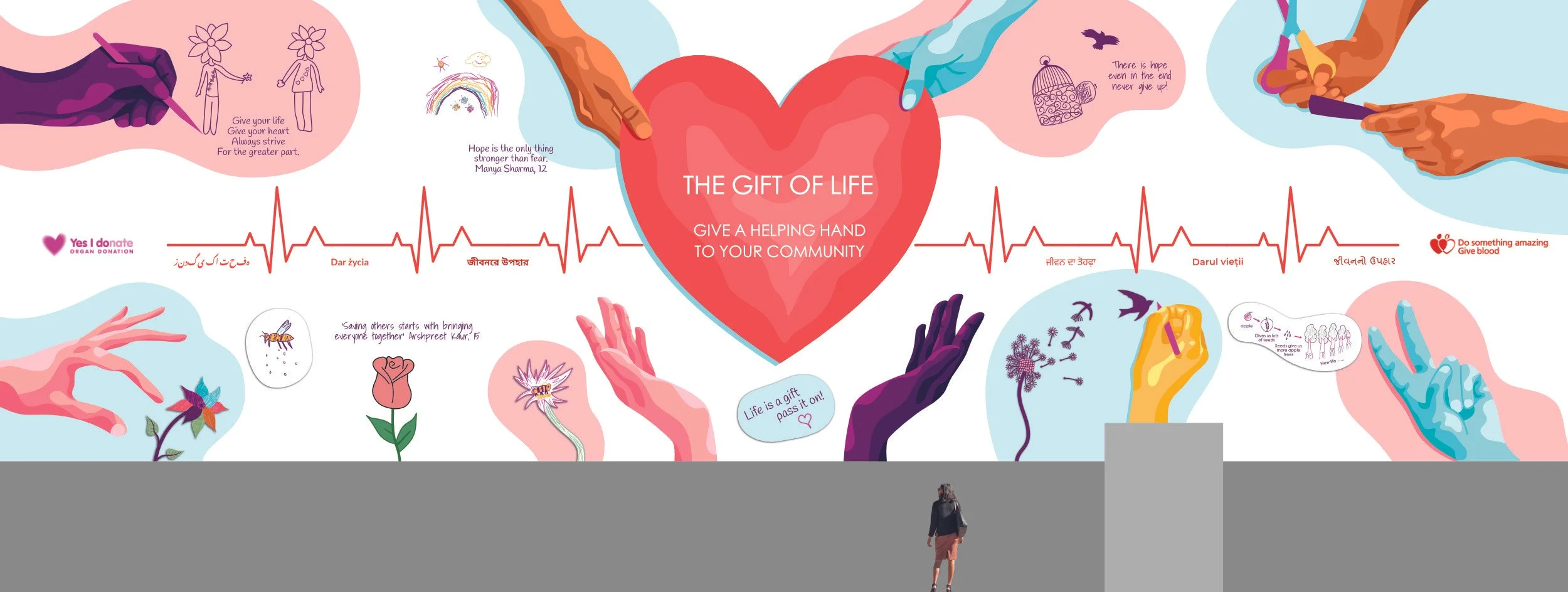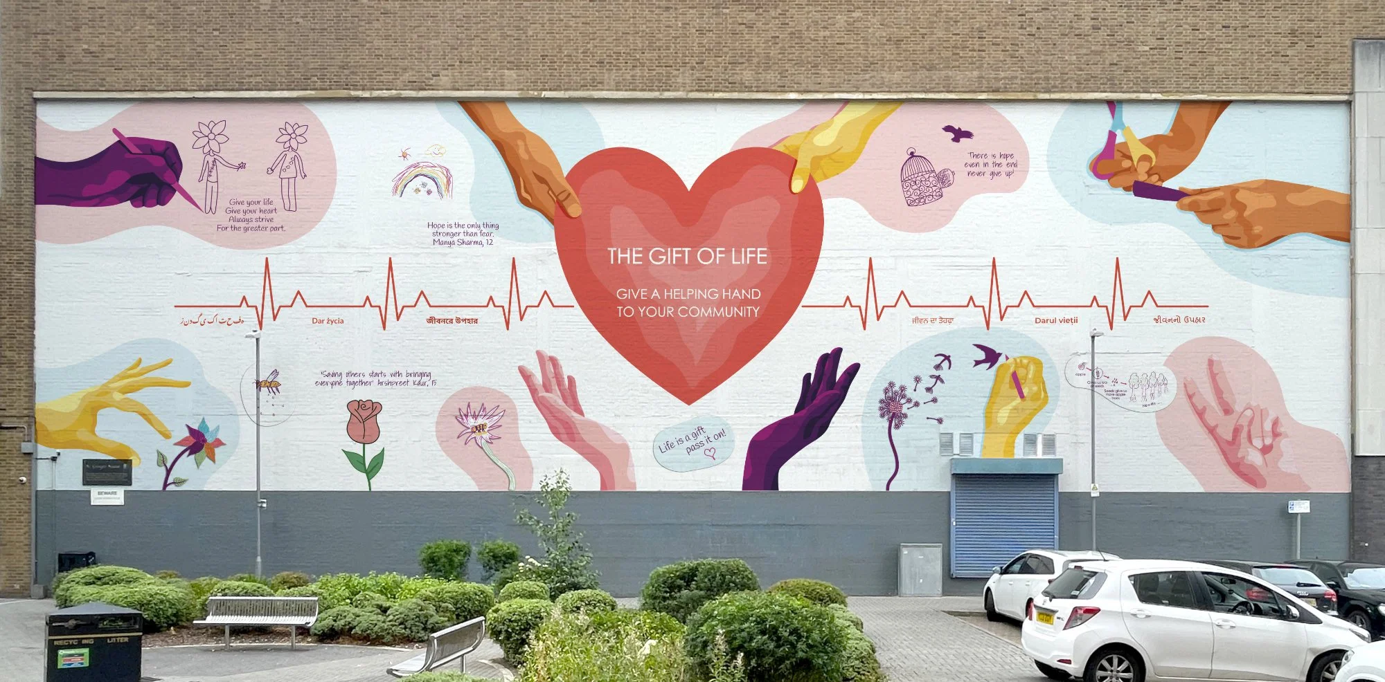 The central heart is a universal symbol of love, and here it also represents organ donation. Inside it, the words ‘The Gift of Life’ appear in English and flow along a ‘lifeline’ in six of Luton’s most widely spoken languages – Urdu, Polish, Romanian, Bengali, Punjabi, and Gujarati - celebrating the town’s diversity. Surrounding the heart are drawings, words, and quotes gathered directly from participants during our sessions. These reflect the thoughts, feelings, and creativity of those who shared their voices with us.