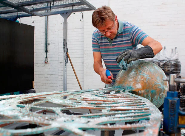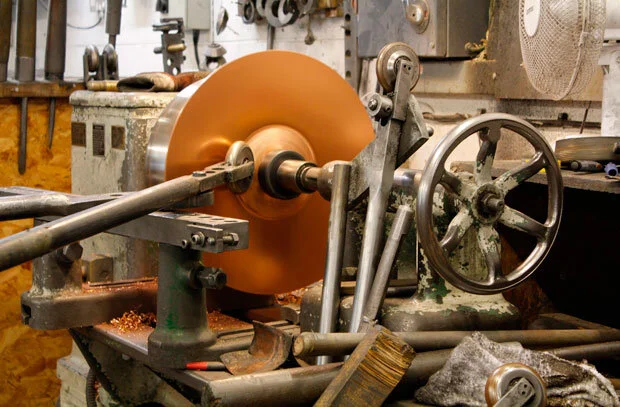 In order to create the 400mm diameter sphere at the base of the seed sculpture, two sheets of 5mm copper were first cut into circular shapes and then formed around a solid steel hemisphere in a highly skilled traditional process called spinning.